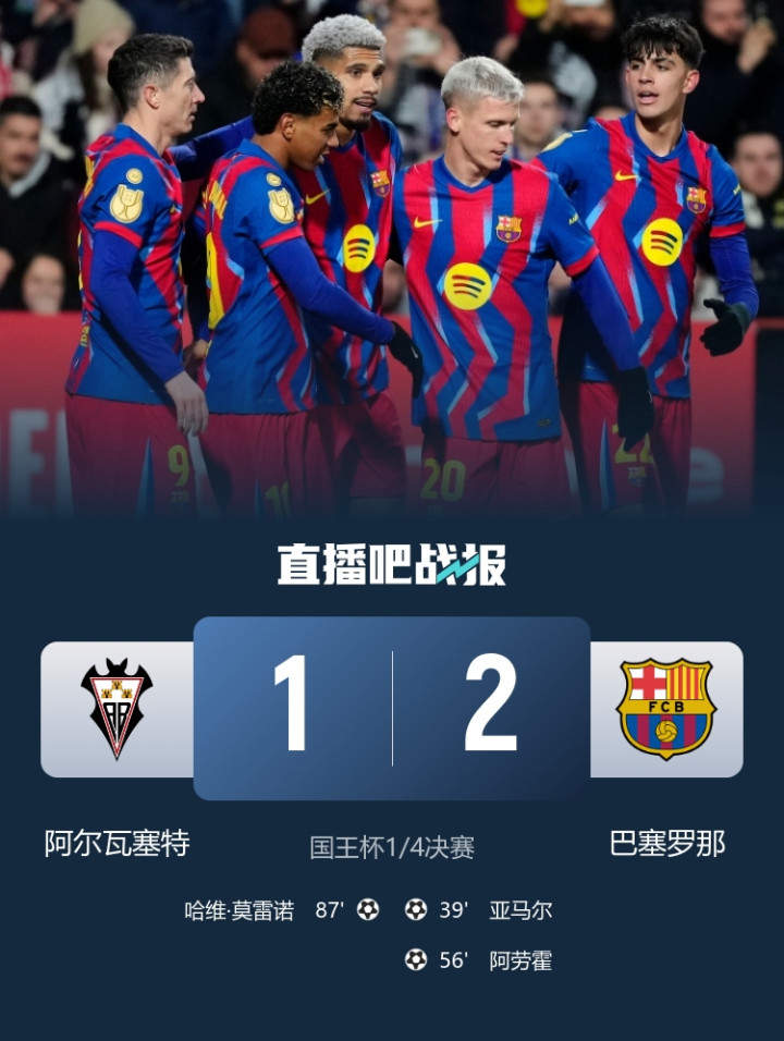 直播吧02月04日讯西班牙国王杯1/4决赛,巴萨2-1战胜阿尔瓦塞特,挺进半决赛。