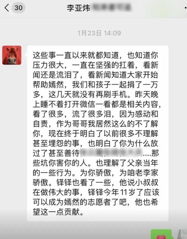 李亚炜说,这些事一直以来就王人知谈,也知谈你压力很大,一直执意的扛着,看到新闻照旧哭泣了,世界王人在匡助嫣然,我方和孩子也捐了一万多。