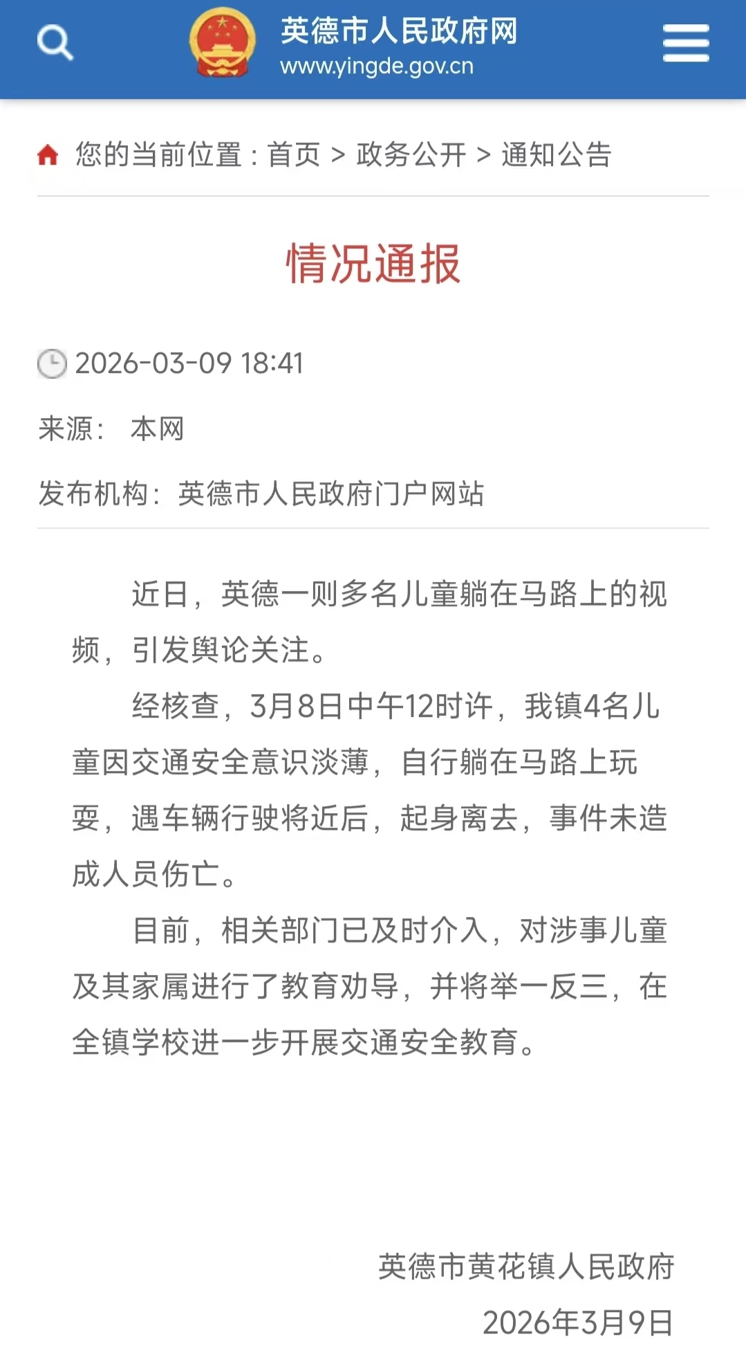 9日晚间,英德市黄花镇政府就此事发布情况通报称,幸运8app经核查,3月8日中午12时许,该镇4名儿童因交通安全意志恬澹,自行躺在马路上玩耍,遇车辆行驶快要后,起身离去,事件未形成东谈主员伤一火。现在,相干部门已实时介入,对涉事儿童过甚家属进行了教训劝导,并将举一反三,在全镇学校进一步开展交通安全教训。