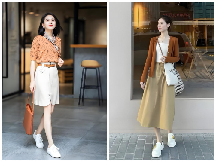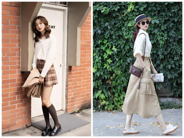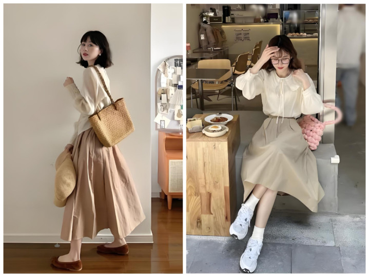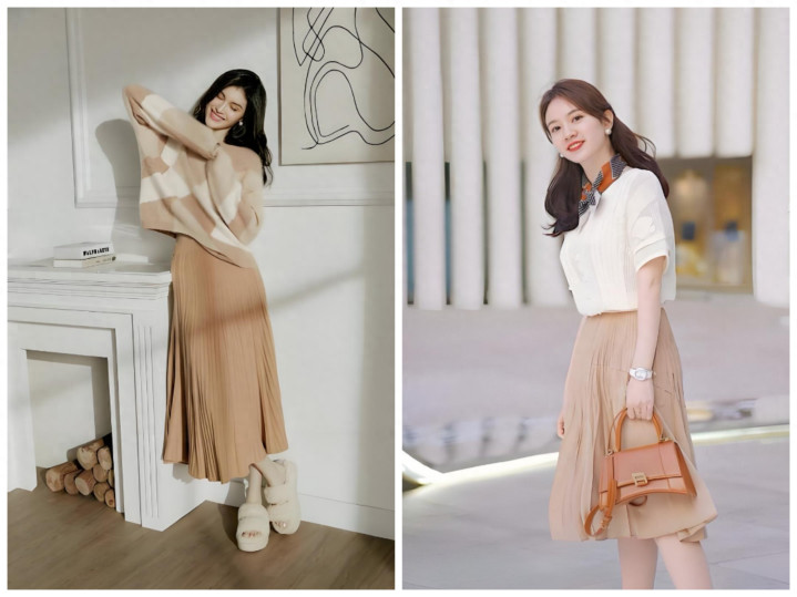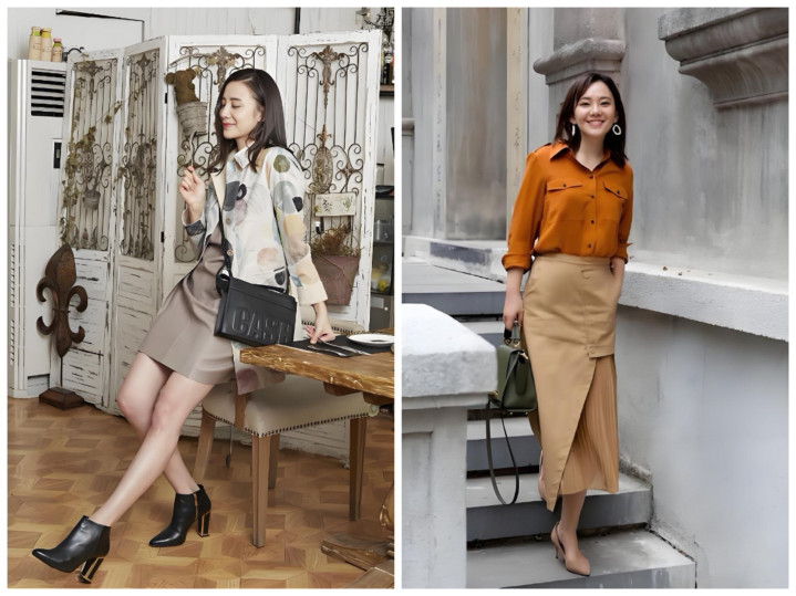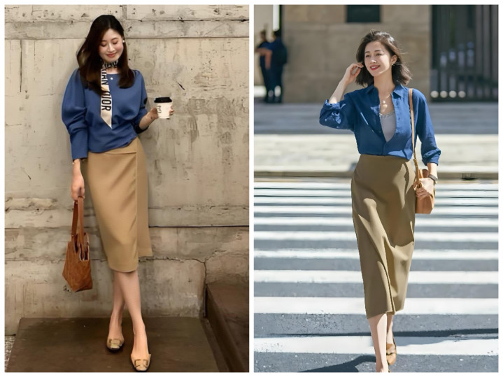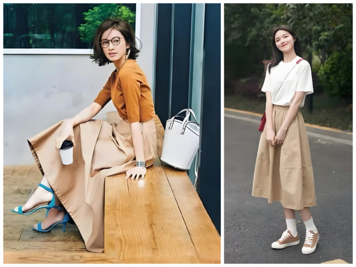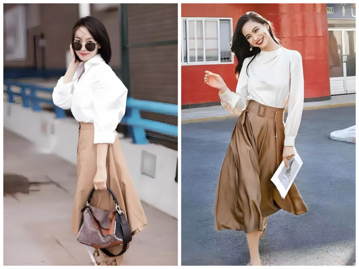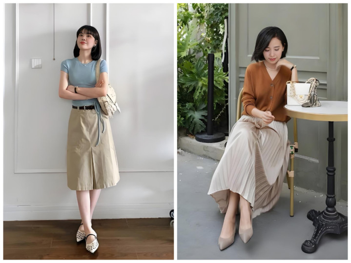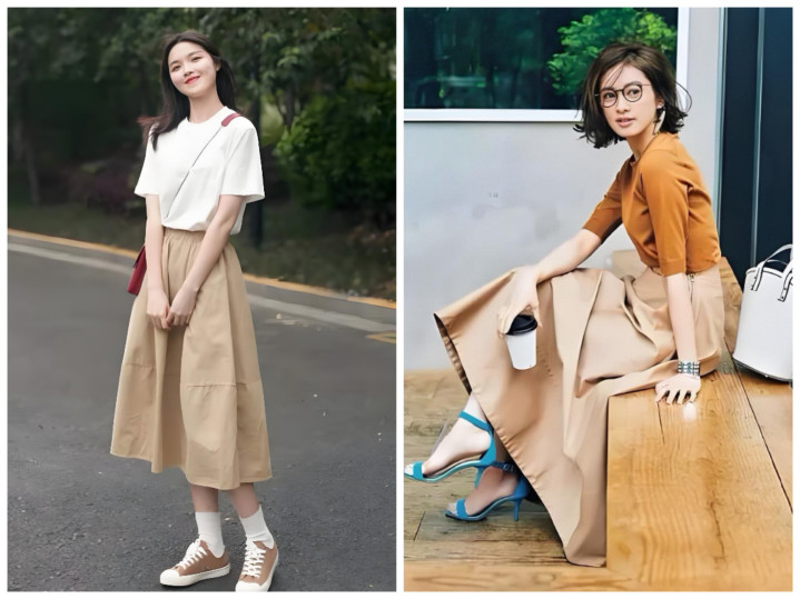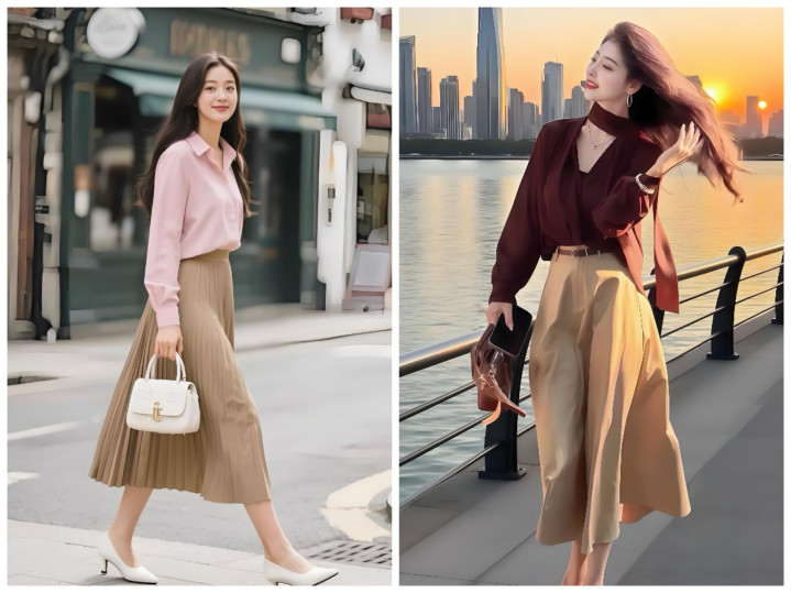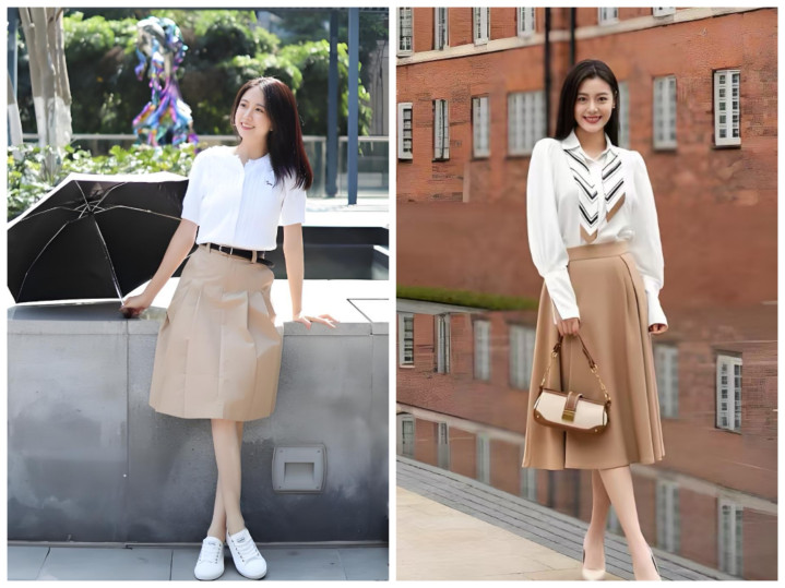 不用死板穿同色,主打深浅层次:浅卡其半裙搭燕麦色针织衫、深卡其半裙搭焦糖色缎面衬衫,材质上做对比更出彩——软糯针织配挺括西装料半裙、哑光棉麻配微光泽贡缎半裙,靠材质层次提升精致度,完全不单调。
