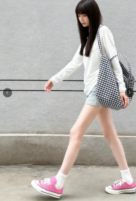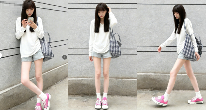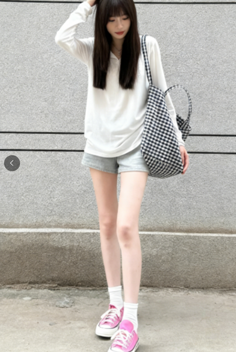 第一张里,女孩斜靠着墙低头看手机,单腿弯曲的姿势不是为了显腿长而设计的角度,更像是等朋友时自然放松的状态。白 T 和短裤的搭配没有多余装饰,却因为粉白撞色的帆布鞋和格纹包,在极简里透出一点鲜活的少女感。很多人追求的氛围感,其实不是靠大牌堆出来的,而是这种 “我没在刻意拍照,只是刚好被记录” 的松弛。