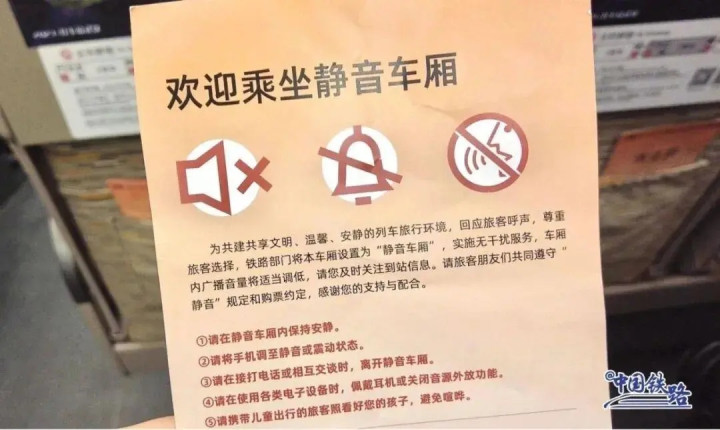 车厢内设置规范统一的静音标志和服务提示卡,列车工作人员采用轻声服务,并配备一次性耳塞供有需求的旅客使用。同时,旅客在车厢内须遵守将手机等电子设备调至静音或震动状态、在使用电子设备时佩戴耳机或关闭音源外放功能等静音约定。