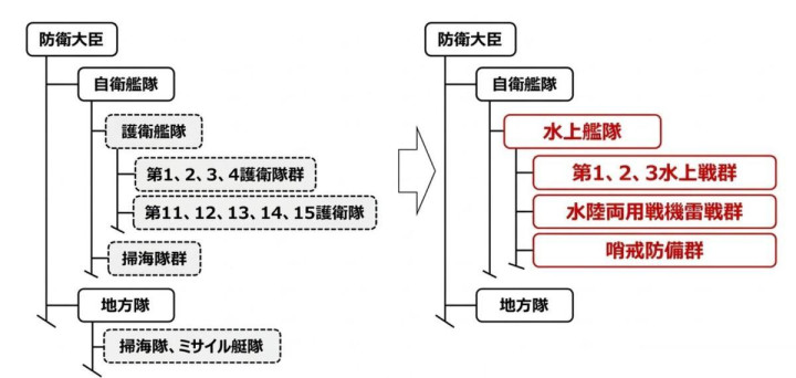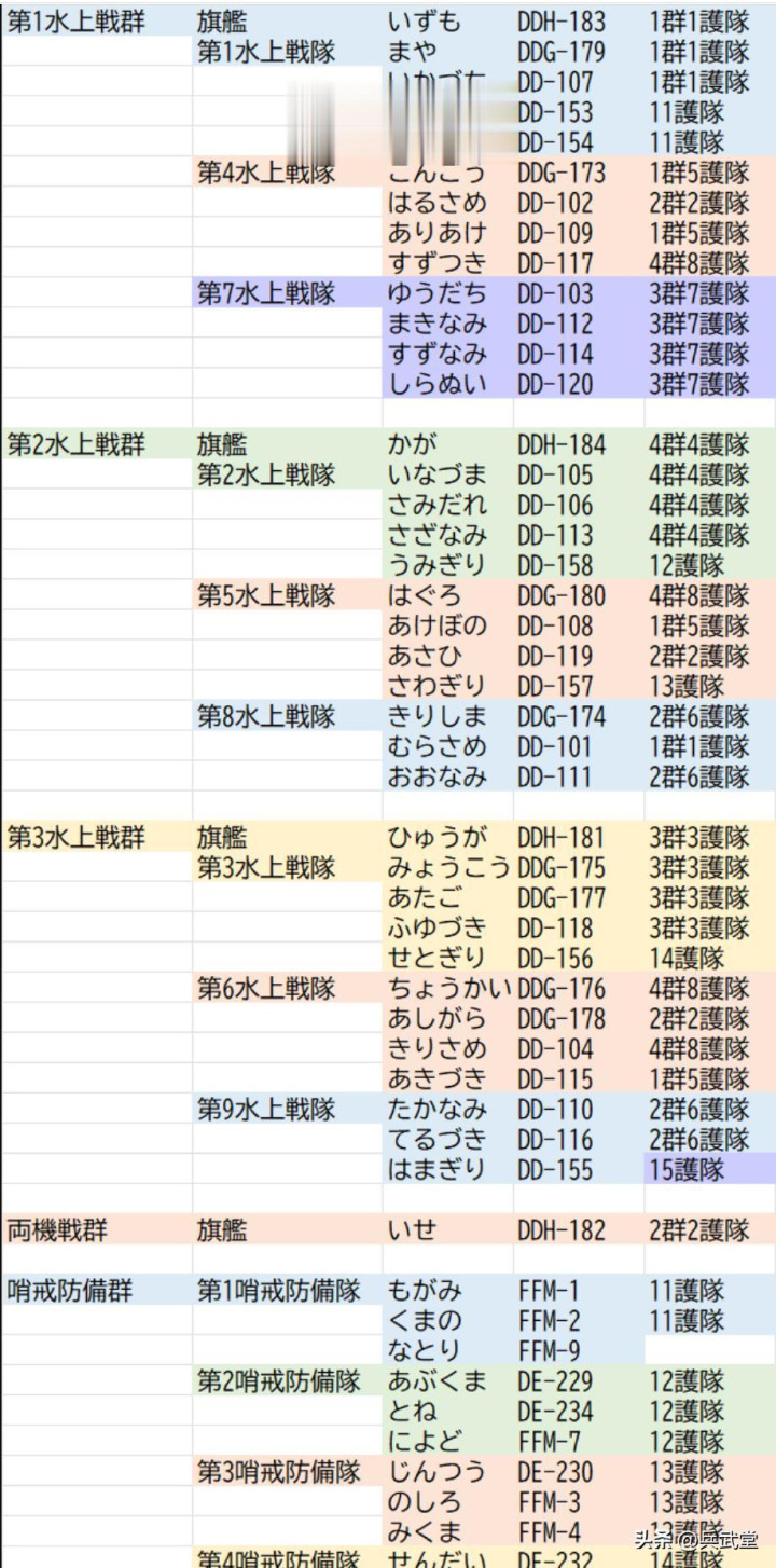 日本海上自保队3月23日晓谕,决定废止始终以来的“护卫舰队”编制,重组为“水上舰队”。这亦然日本自保队建筑以来最大范围的编削。那么这事有多大影响,还要从日本海自的旧有编制提及。