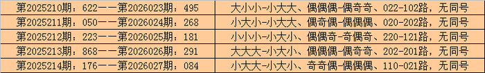 在排列三历史开奖中,第2025210期-第2025214期连续5期奖号为:622-050-223-868-176。