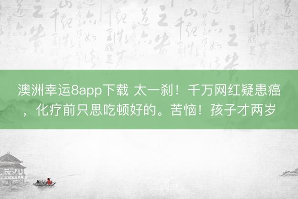 澳洲幸运8app下载 太一刹!千万网红疑患癌,化疗前只思吃顿好的。苦恼!孩子才两岁领有千万粉丝的闻名网红一栗小莎子近日一刹传来战抖音书,疑似确诊为淋巴瘤,并已文书将暂时停工运滚动疗。这一变故速即引爆了全网,激发了大王人粉丝和公众的崇尚与盘问。她蓝本凭借其独到的气质和外形速即崛起,成为外交平台上备受爱好的蓝衣女神,但在业绩正处于巅峰时,她却遇到了运说念的千里重打击,让东说念主不禁齰舌,生命的脆弱和不成瞻望。她的