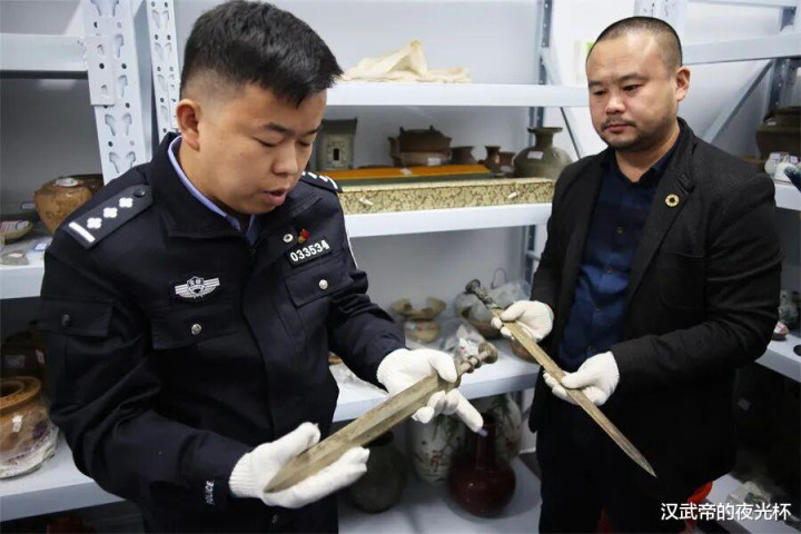 安徽安庆,潜山皖光苑,办案民警与潜山县博物馆副馆长李騊沿路展示二级文物——战国时期镶青金石竹节把青铜古剑。张铮 摄