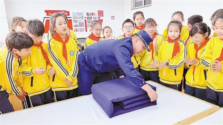 消防员演示“豆腐块”被子叠法。本报通信员李金双宋围摄