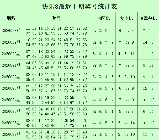 福彩快乐8第2026027期开奖回顾:01 04 07 14 18 26 28 37 38 49 51 58 61 62 64 67 71 75 76 79,其中奖号四区比为5:4:3:8,冷温热码比为3:7:10,大小比为11:9,和值为886,同尾号码为01 51 61 71、04 14 64、26 76、07 37 67、18 28 38 58、49 79。