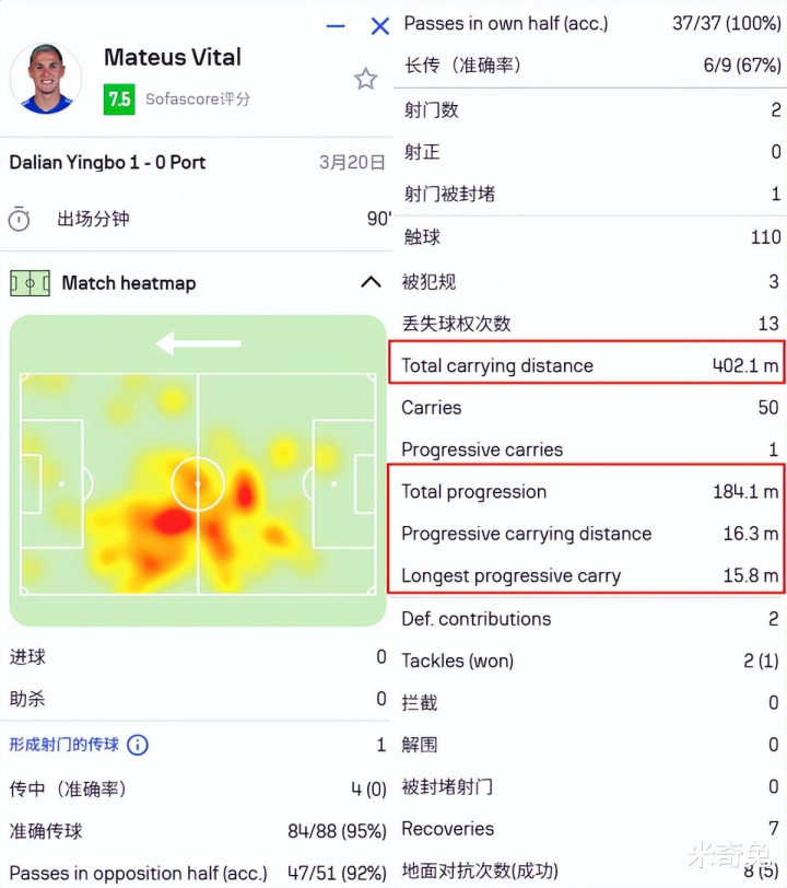从维塔尔的数据上不错看得很澄澈,他的带球距离果然是惊东说念主的402.1米(整个带球50次),上前鼓动距离是184.1米。