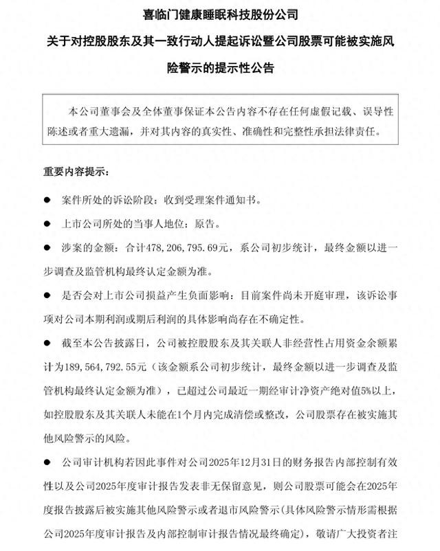 4月1日晚间,喜临门发布多项公告称,因涉嫌信息露馅坐法非法,中国证监会决定对喜临门及骨子要领东说念主陈阿裕别离立案拜访。喜临门荒谬子公司算作原告,将控股鼓吹荒谬一致行动东说念主告上法庭,涉案金额4.78亿元。同期,控股鼓吹荒谬一致行动东说念主的股份被功令冻结。