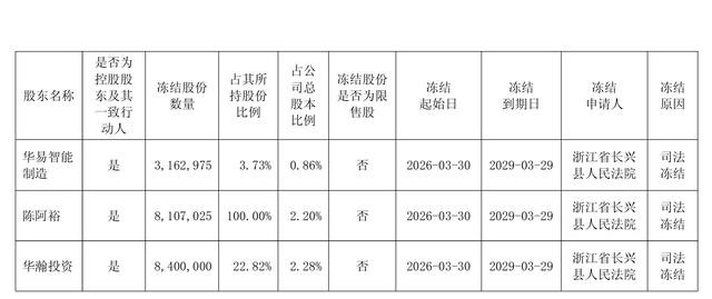 与此同期,控股鼓吹荒谬一致行动东说念主的股份也被功令冻结。骨子要领东说念主陈阿裕握有的810.7万股一皆被冻结,占其所握股份的100%;华易智能制造被冻结316.3万股,华瀚投资被冻结840万股。