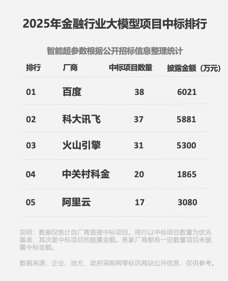1月31日音讯,确认近期媒体对2025年公开商场大模子干系招投标信息的统计,金融行业全年大模子中标面容达587个,中标金额约15.06亿元,较2024年分别增长341%、527%。其中,百度智能云鸠合两年景为中标面容数和中标金额最多的厂商。