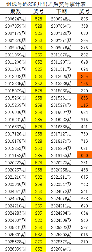 体彩排列三组选号码258历史上出现了33次,其下期奖号分别为:895、368、680、295、376、892、648、094、855、166、320、833、115、624、916、401、739、713、021、060、231、468、675、742、341、968、649、034、843、397、016、370,详细统计见下表:
