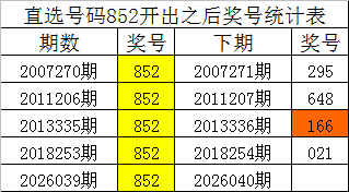 从上表统计可以看出,直选号码852开出之后,其下期奖号: