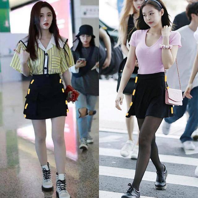 A字裙版型稳当小个子女生,上收下放,爽气打造大长腿。鞠婧祎黄色格子小衬衫搭配玄色A字半裙,澳洲幸运8app脚穿白色马丁靴