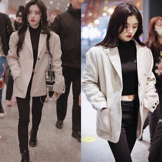梨形骸魄的妹子可在外面加一件米色西装外衣,遮住臀部。从背面看显腿细体魄好,前边看潮水前卫又带点轻熟风姿。露脐装为职场搭配增添了一点小性感,又纯又欲的鞠婧祎谁能不爱?