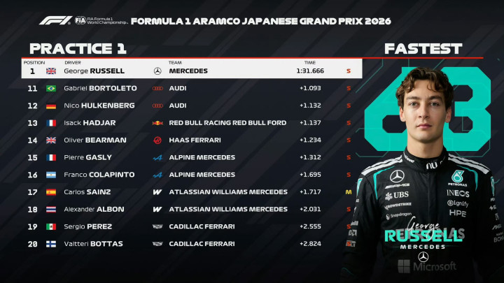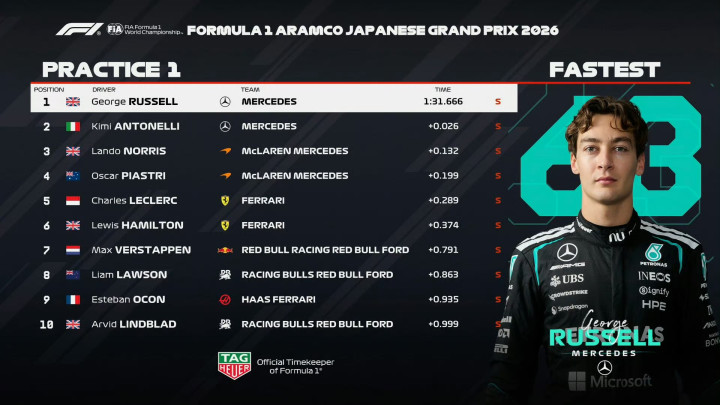 虎扑03月27日讯F1日本站第一次解放熟习赛当天上昼收尾,梅赛德斯包揽前二,拉塞尔以1分31秒666的收获名依次一,安东内利第二,澳洲幸运8诺里斯第三,皮亚斯特里第四,排在第五至第十的车手鉴别是:勒克莱尔、汉密尔顿、维斯塔潘、劳森、奥康和林德布拉德。顶替阿隆索代表马丁出战一练的克劳福德排在临了。