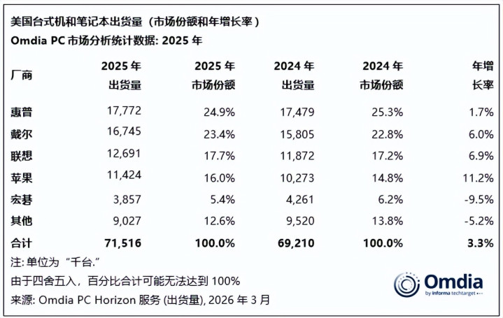 凭证知名调研机构Omdia的陈诉露馅,2025年巨匠PC出货量达到2.787亿台,同比增长9.1%。其中,札记本(含出动责任站)出货量2.197亿台,较2024年增长7.5%;台式机(含台式责任站)出货量5910万台,同比增长14.5%。联思(7085.1万台)、惠普(5744.0万台)、戴尔(4113.0万台)、苹果(2767.4万台)、华硕(2006.7万台)。