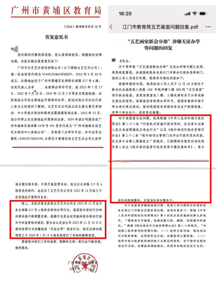 邹先生举报五艺画室涉嫌违规办学,广州黄埔区教育局、江门新会区教育局曾作出答复