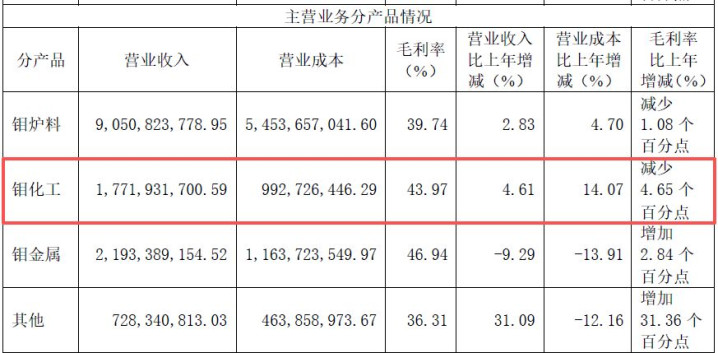 此外,金钼股份讲解期内,部分主营业务毛利率下滑,商业业务松开。总体来看,在各种钼居品价钱全体飞腾的布景下,其“钼化工”居品的毛利率却同比减少了4.65个百分点至43.97%;同期,“商品商业”板块营业收入同比下落18.12%,本钱同比下落18.2%。金钼股份在年报中坦言:“公司从事单一钼产业洽商,功绩受行业周期性波动影响相对较着。”