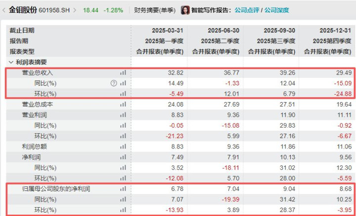 分季度来看,2025年第四季度,金钼股份已毕营收29.49亿元,同比下滑15.09%、环比下滑24.88%;已毕归母净利润8.68亿元,同比增长10.25%、环比下滑3.95%。
