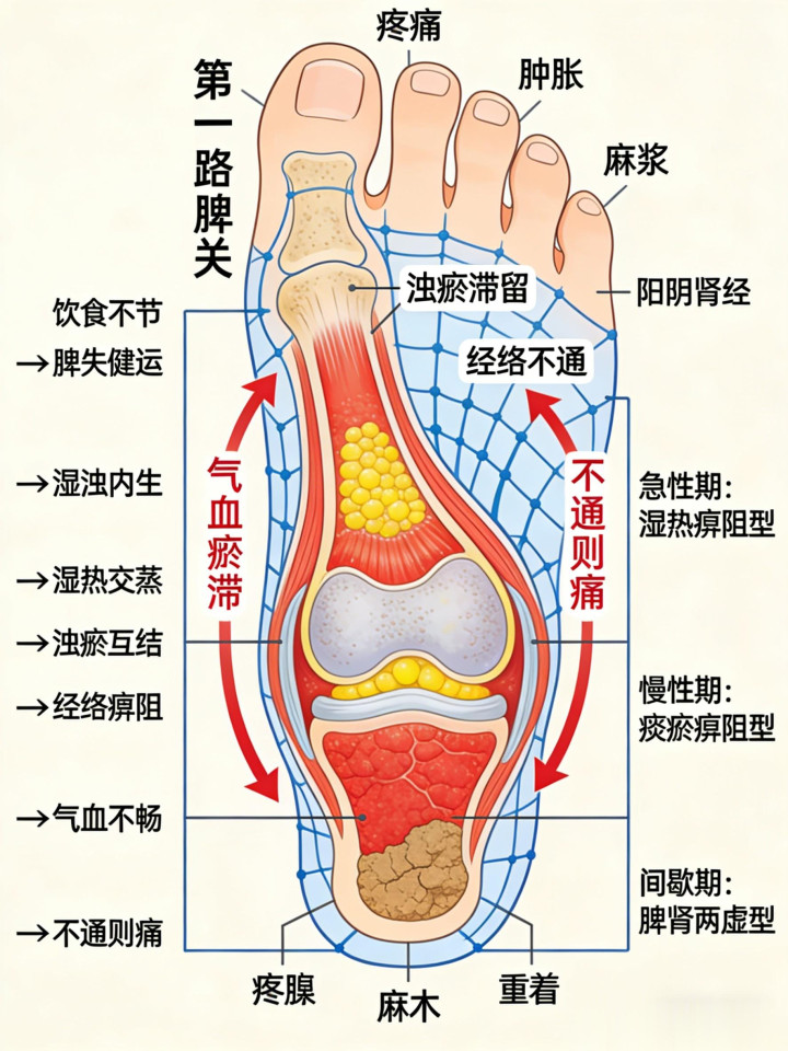 第二个佐证,除了痛风枢纽偶合是脾肾经循行部位外,痛风疾病的发生发展也和脏腑尤其是脾肾生理功能好不好密切关系。
