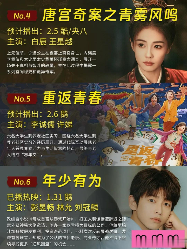 这8部剧集涵盖了不同的题材与风格,每一部都有着自己的特色,喜欢悬疑的可以选择《风过留痕》《有罪之身》,偏爱古装的可以看《唐宫奇案之青雾风鸣》《成何体统》,想感受现实生活的可以追《年少有为》《夜色正浓》,喜欢轻松治愈的则能从《重返青春》《生命树》中找到快乐。