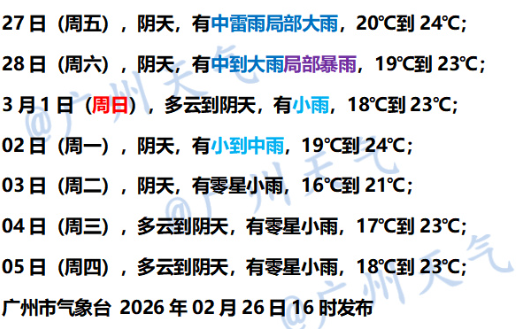 广州市表象台预测,2月27日—28日,受高空波动、切变线和弱冷空气共同影响,广州有中到大雨局部暴雨,并伴有雷电、短时强降水(最大小时雨强20~40毫米)、局地短时大风(6~8级)等强对流天气。