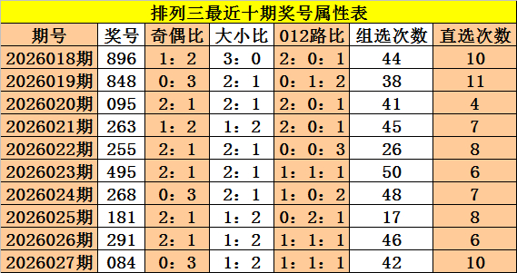 上期回顾:体彩排列三第2026027期奖号:084,奇偶比0:3,大小比1:2,012比1:1:1。