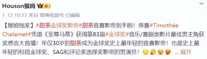 最近,他又凭一部竣事级新片,成为金球奖最年青影帝(音乐/笑剧类),奥斯卡影帝大热点。
