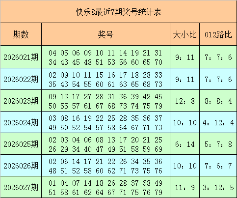 快乐8第2026027期奖号为:01 04 07 14 18 26 28 37 38 49 51 58 61 62 64 67 71 75 76 79,其中奖号012路比为3:12:5,大小比为11:9。