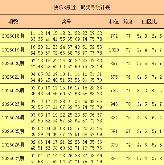 快乐8第2026027期奖号开出:01 04 07 14 18 26 28 37 38 49 51 58 61 62 64 67 71 75 76 79,其中奖号和值为886,跨度为78,四区比为5:4:3:8。