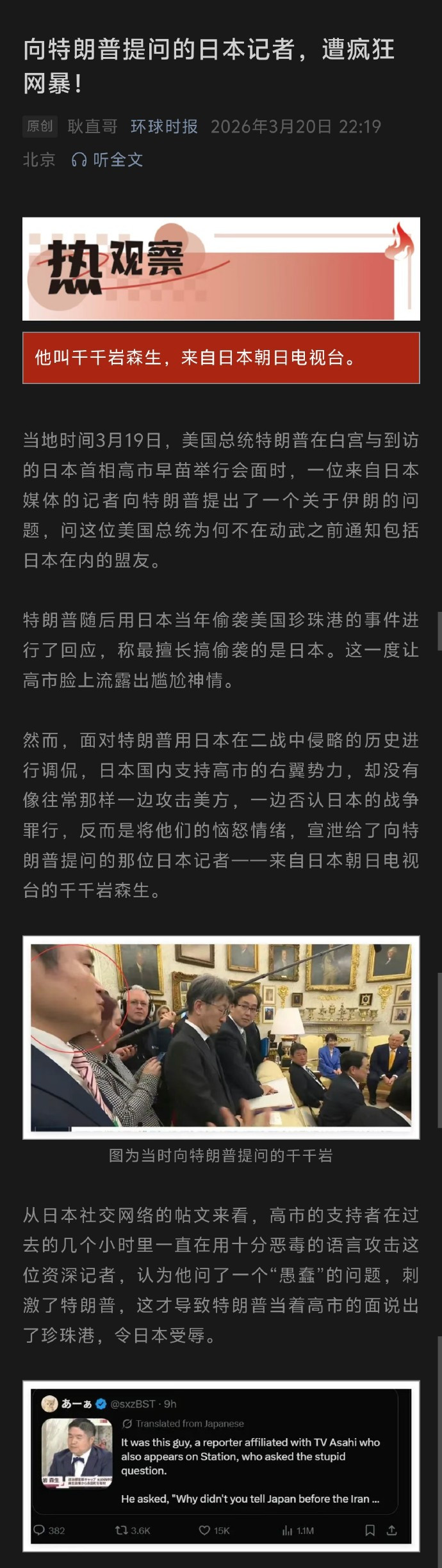 高市早苗白宫行之后,现场发问的日本记者千千岩森生遭到了日本国东说念主的猖獗网暴。