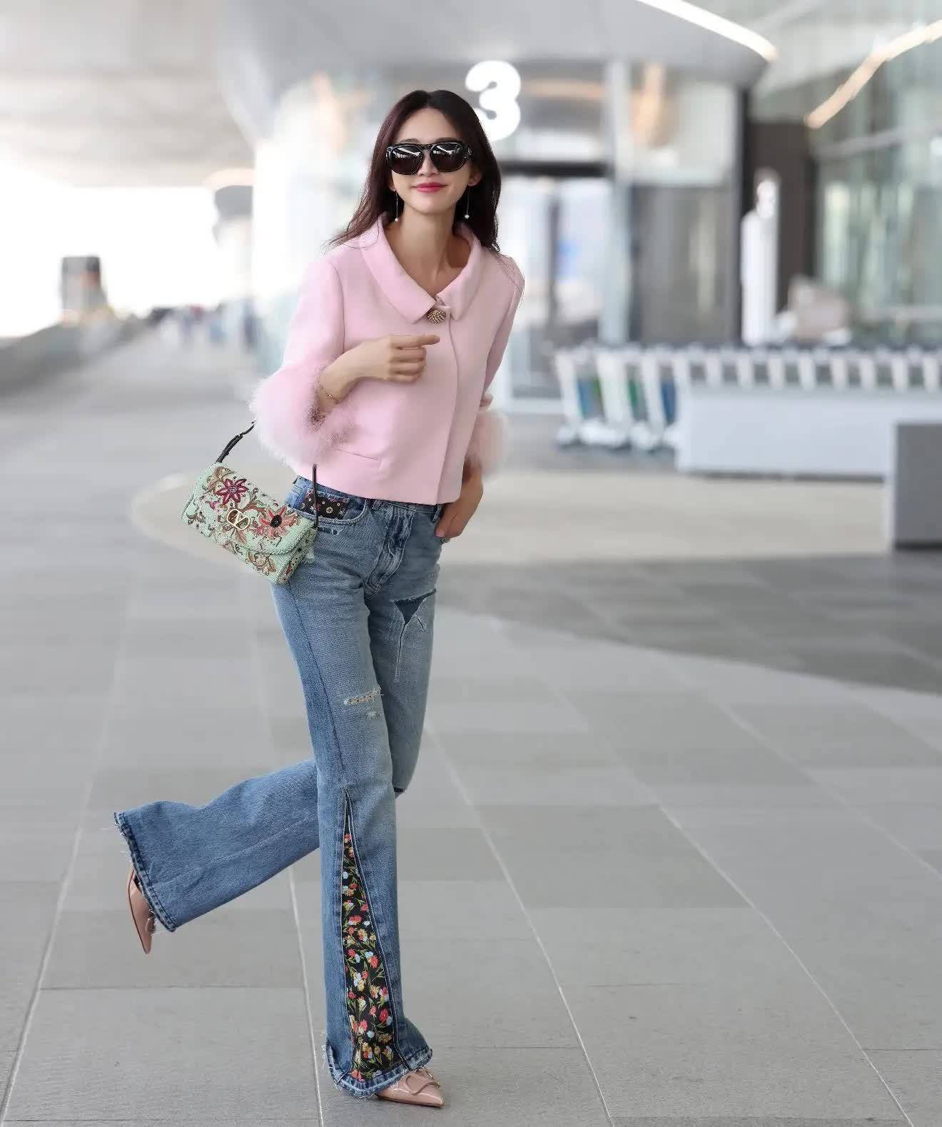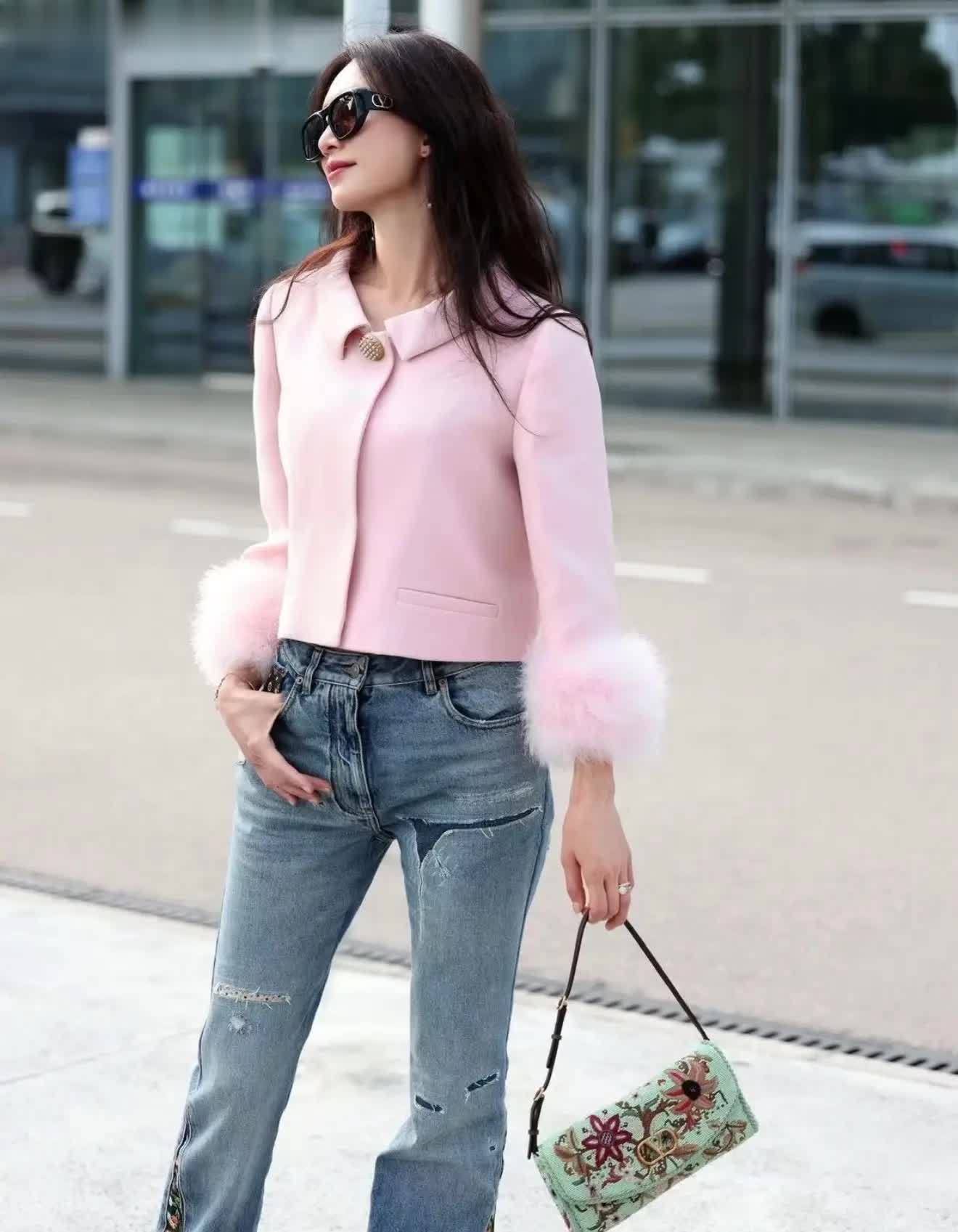 林志玲50+的年齿依旧保抓闻明模级的优厚身形!穿粉色短夹克自带青娥感,领口策动满满细节,短款策动突显腰线!